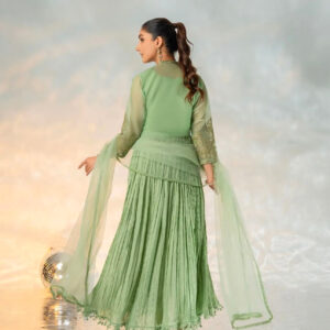 Crafted in a delicate pistachio hue, this 3PC set features a flowing crush silk shirt, an elegant matching dupatta, and a beautifully tailored jacket for a look that is both timeless and sophisticated. The lightweight, crushed silk fabric drapes effortlessly, giving you a graceful silhouette perfect for festive occasions, weddings, or evening gatherings.